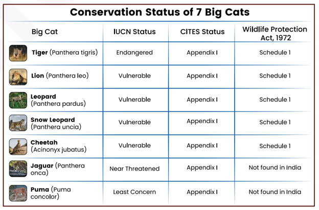 - Aim: Conserving seven big cats – Tiger, Lion, Leopard, Snow Leopard, Cheetah, Jaguar, and Puma.