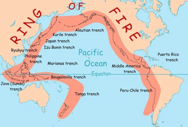 - It lies at the heart of the Ring of Fire, which accounts for 75% of the worldâs volcanoes and 90% of earthquakes.