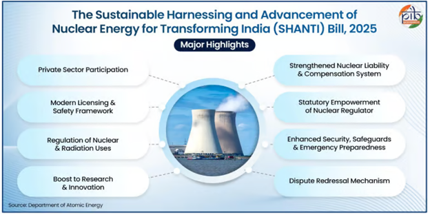 - The SHANTI (Sustainable Harnessing of Advancement of Nuclear Technology for India) Act 2025, have triggered concerns regarding safety standards, victim compensation, and long-term energy strategy.